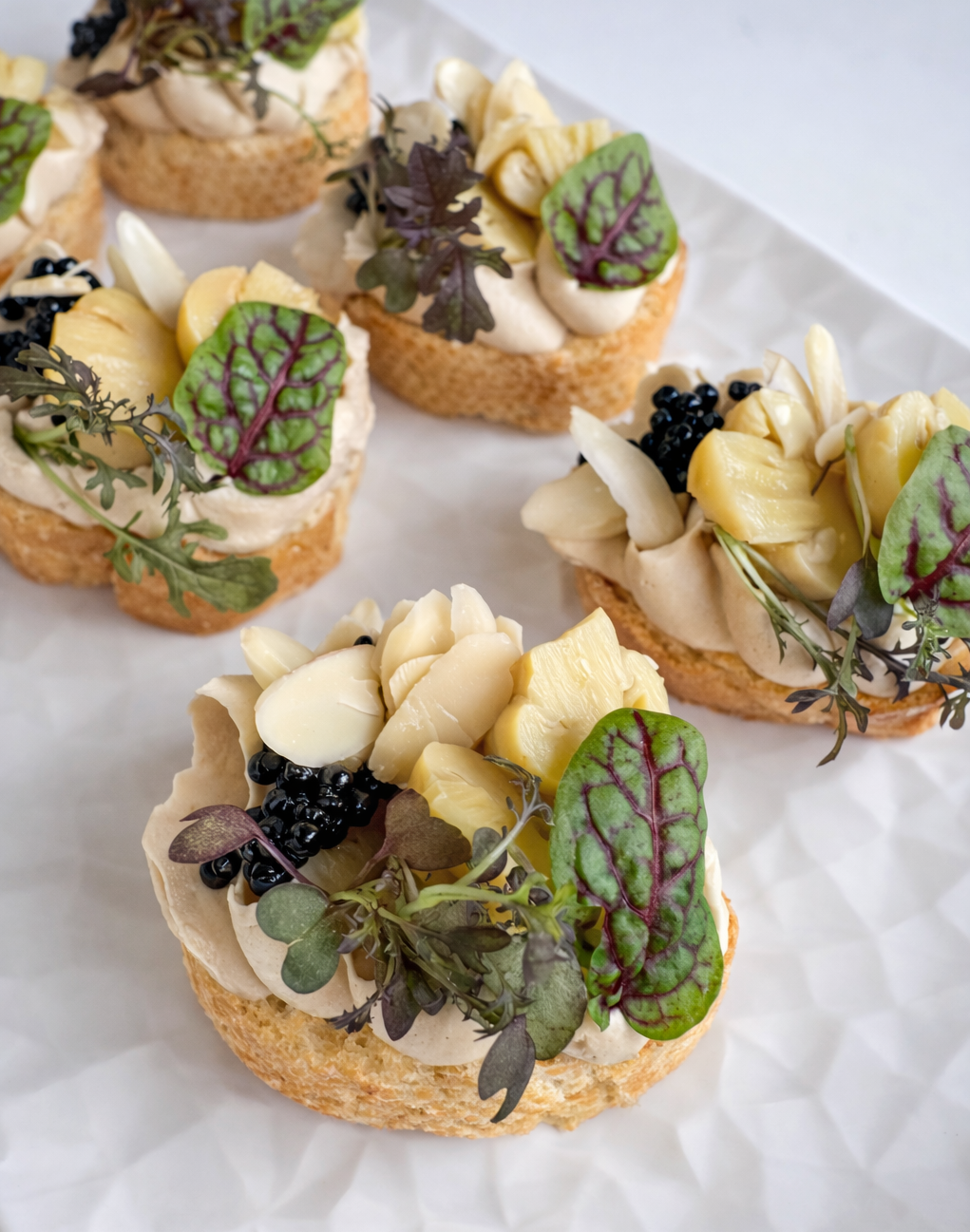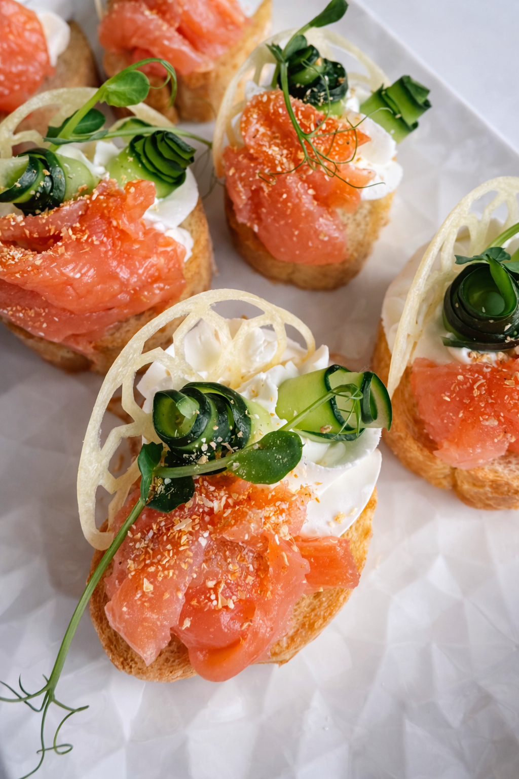 Канапе фаршмак з перепелиним яйцем на грінці з білого хліба